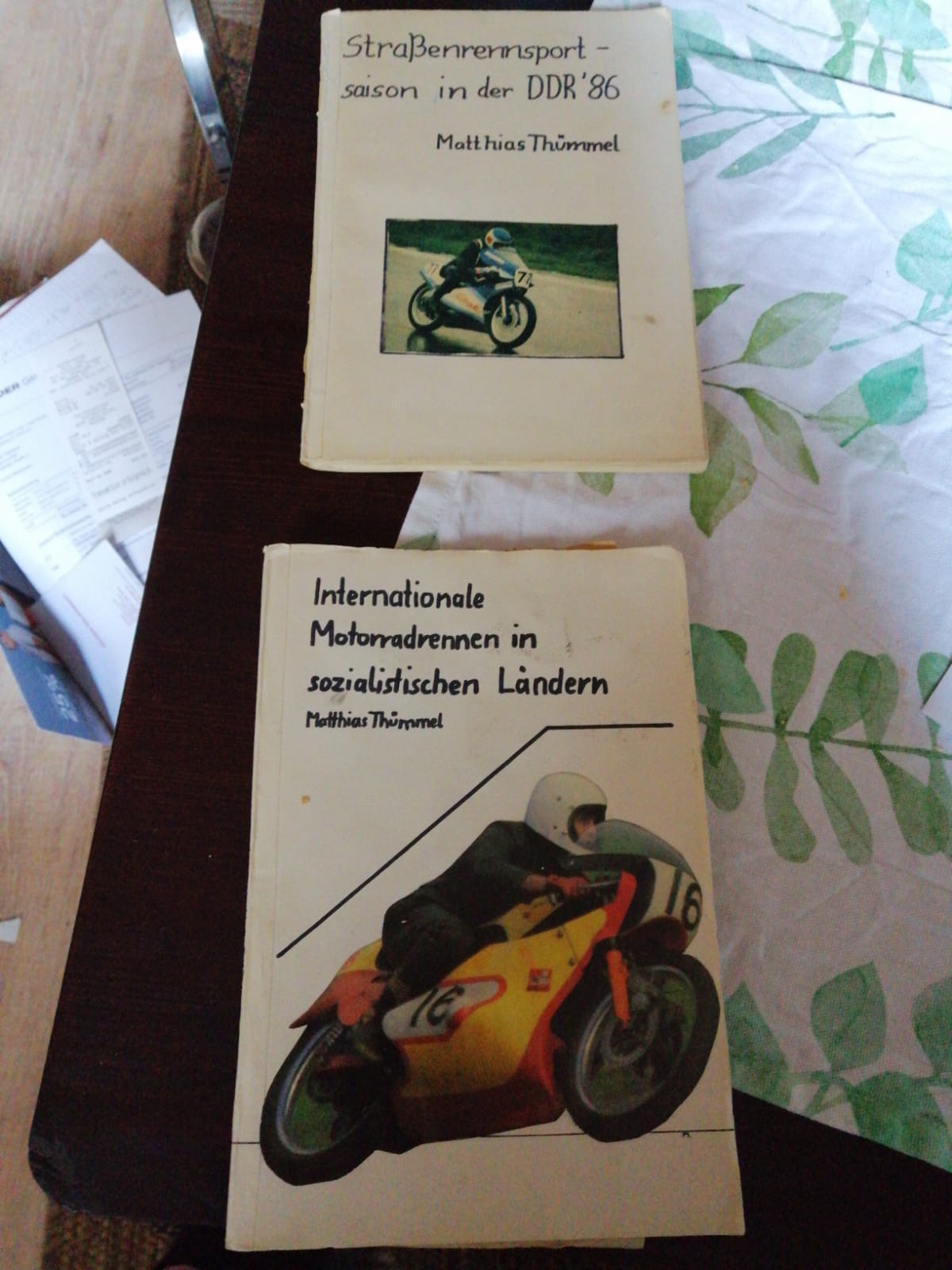 Mein Vater war damals „Rennfahrer ausser Dienst“ (er fuhr in den 1960er Jahren) und ich durchforstete alte Dokumente aus seiner Zeit und beobachtete den aktuellen Motorradrennsport – und bastelte daraus Bücher … 2 unvollendete Exemplare habe ich noch in meinen Besitz (siehe Abbildungen), die anderen sind irgendwann durch Umzug und Co. verlustig gegangen.